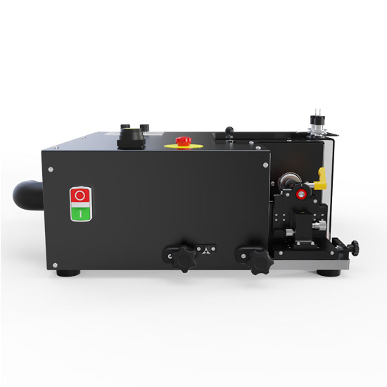 Up to three ISO20 drill chucks are supplied as standard, enabling fast tool changes without reconfiguration. A brushless motor with closed-loop BLDC control provides smooth speed regulation up to 4000 rpm, while an internal belt-drive system ensures quiet operation and consistent torque delivery. Integrated internal fan cooling supports sustained duty cycles. Operator safety is addressed through a polycarbonate safety cover with reed-switch interlock, preventing machine operation unless the cover is correctly positioned. An emergency stop is fitted as standard. An integrated dust-extraction channel allows connection to an external extraction system to manage MgO debris during drilling. The machine is bench-mountable via integrated mounting points and is configured for worldwide operation using a single-phase power supply.