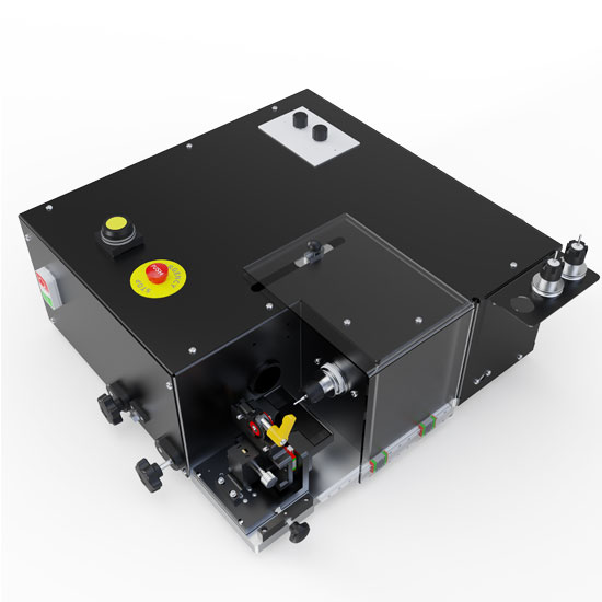 Up to three ISO20 drill chucks are supplied as standard, enabling fast tool changes without reconfiguration. A brushless motor with closed-loop BLDC control provides smooth speed regulation up to 4000 rpm, while an internal belt-drive system ensures quiet operation and consistent torque delivery. Integrated internal fan cooling supports sustained duty cycles. Operator safety is addressed through a polycarbonate safety cover with reed-switch interlock, preventing machine operation unless the cover is correctly positioned. An emergency stop is fitted as standard. An integrated dust-extraction channel allows connection to an external extraction system to manage MgO debris during drilling. The machine is bench-mountable via integrated mounting points and is configured for worldwide operation using a single-phase power supply.